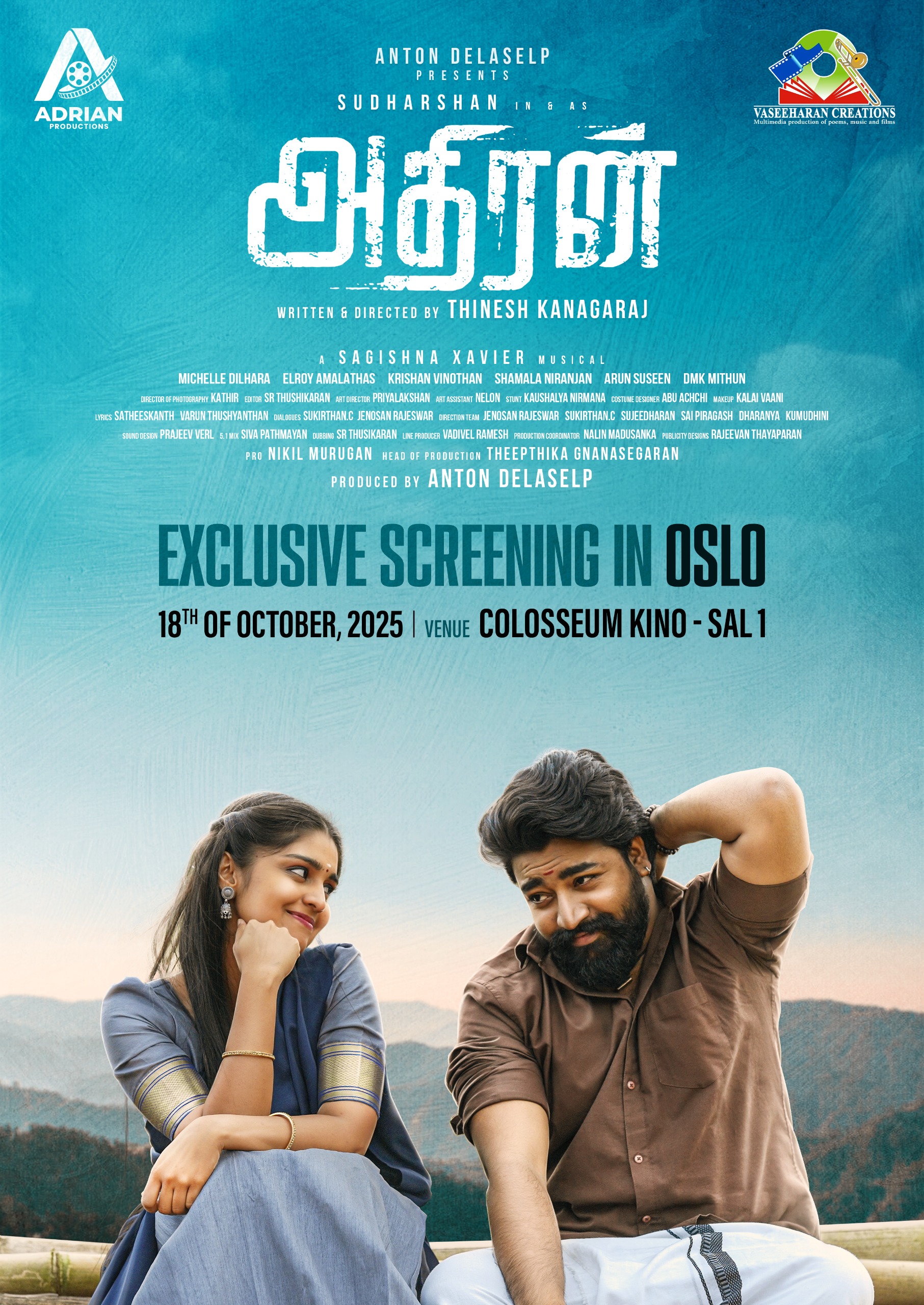 Adhiran is a Sri Lankan Tamil-language film directed by Thinesh Kanagaraj, produced by Anton Delaselp under Adrian Productions, and starring Sudharshan Raveendran and Michelle Dilhara. The film, which is the first Sri Lankan Tamil film by the production house, was recently featured at a trailer launch event and is slated for global releases, with a premiere announced for Paris and Oslo.
